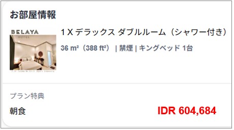 宿泊料金は1泊2日で Rp. 604,684(朝食付き)でした。